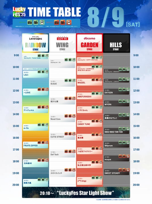 LuckyFesでは、昨年に引き続き撮影及びSNS投稿は原則OKとします。ただし、撮影及びSNS投稿がNGなアーティストの方々もいますので、各アーティストの意思を尊重してルールを遵守していただきますようお願いします。撮影などの可否についてはタイムテーブルに記載していますので、注意事項と合わせてご確認ください。