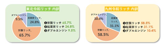 東北・九州における令和リッチは世襲リッチが大多数となり、ダブルエンジンが少ない傾向となりました。東北では、起業家リッチが24.8%、世襲リッチが65.7%、ダブルエンジンが9.5%。九州では起業家リッチが31.1%、世襲リッチが58.5%、ダブルエンジンが10.4%でした。