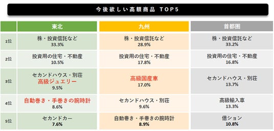 今後欲しい高額商品を見ると、TOP2はエリア共通で「株・投資信託など」、「投資用の住宅・不動産」となりました。3位以下は東北では、「高級ジュエリー」や「自動巻き・手巻きの腕時計」など宝飾品へのニーズが高く、九州では「高級国産車」のニーズが高い結果となりました。また、消費に対する意識では、東北では「他人から見えないものは安物でもよい」、「1円でも安いお店で買いたい」が高く、コスト意識の高さが伺えました。九州では「高額商品は、費用対効果を考えて購入する」、「比較して慎重に選び購入する」が他のエリアよりポイントが低く、直観的な消費意識が高い結果となりました。