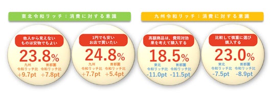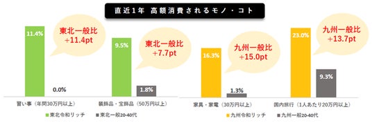 今回はローカル版第一弾として、東北・九州エリアにフォーカスをし、20代~40代の既婚者を一般層と定義して比べたときの、各令和リッチ属の消費傾向の違いを分析しました。