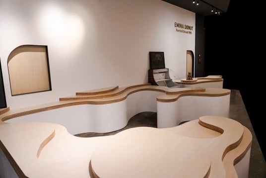 まるで列島のような島模様の什器テーブルには、沢山のエミナローカライズド・ドーナツ達が並びます。お客様に「旅してもらうような」そんなひと時をお届けするべく、店舗デザインしました。北海道ならではの細かな仕掛けや、プロダクトも彩ります。