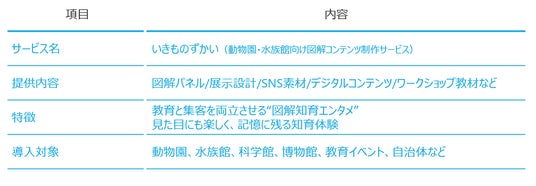 「いきものずかい」は、“モノゴトを多視点から構造化して可視化する”という図解の力を活かし、来園者が自ら発見し、学びたくなる仕掛けを提供します。
