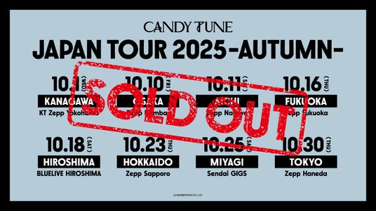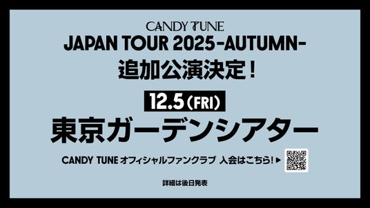 CANDY TUNEが今年10月より全国8都市をまわるグループ初の全国ツアー『CANDY TUNE JAPAN TOUR 2025 - AUTUMN -』がプレイガイド先行でチケットが完売となった。チケット早期完売により一般発売がないことを受け、12月5日(金)に東京ガーデンシアターにて追加公演を開催することが決定した。