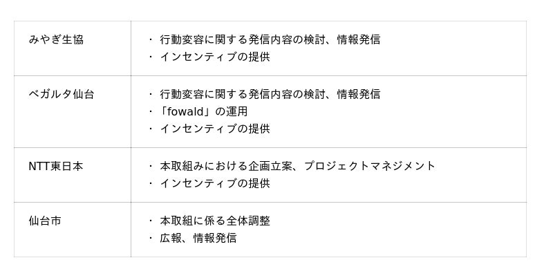 みやぎ生活協同組合(代表理事:尾川 輝敏、以下 みやぎ生協)、株式会社ベガルタ仙台(代表取締役:板橋 秀樹、以下 ベガルタ仙台)、東日本電信電話株式会社 宮城事業部(執行役員宮城事業部長:須藤 博史、以下 NTT東日本)は、仙台市と連携して仙台市民にアプリケーションを通じて脱炭素化につながる行動を促す情報発信を行うことで、市民の環境配慮行動を促進させる取組みを推進します。