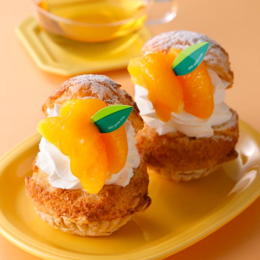 シュー生地、パイ生地、クッキー生地の3層の皮にカスタードクリームとホイップクリームがたっぷり入ったパイシューです。夏限定のオレンジバージョンをご用意。