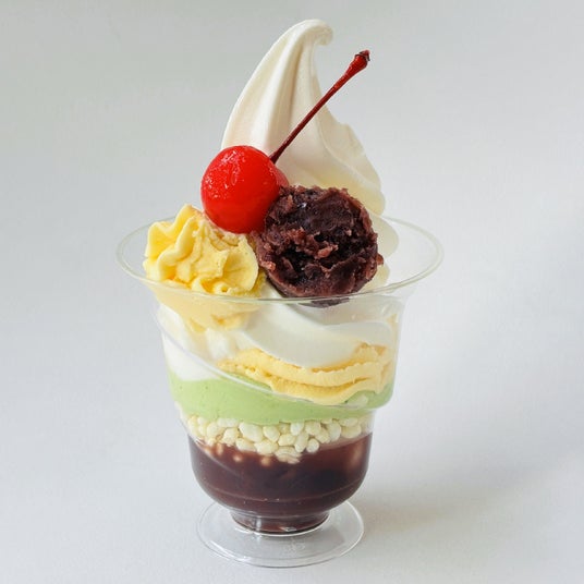 札幌のサザエ食品のあんこ、みれい菓のチーズブリュレ、d.fdの乳酪(ミルク)ソフトクリームのコラボ。スペシャルパフェの誕生です。