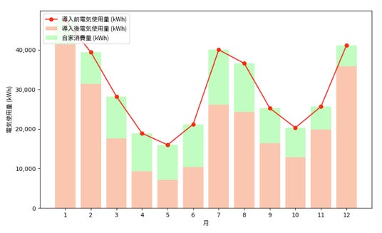 (3)シミュレーションした導入前と導入後の電気使用量と自家消費量のグラフ