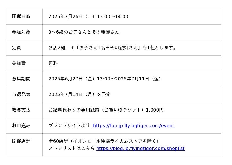 - 『Kids Job Day』は、フライングタイガーがお届けする、親子で参加できる職業体験プログラム。「WORK(働く)」という社会の仕組みを、実際の店舗での就業を通して、親子で学んでいただきます。当日は、レジ打ち・品出しなどの実業務を体験できます。