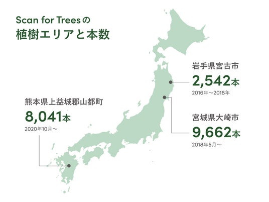 2016年6月、東日本大震災の被災地である岩手県宮古市への植樹からスタートし、その後、宮城県大崎市、熊本県山都町といった被災地や自然保全地域で活動を展開してきました。2022年6月には、営業DXサービス「Sansan」に加えて、経理DXサービス「Bill One」、AI契約データベース「Contract One」で取り込まれた書類も植樹の対象とし、取り組みを拡大しました。 SansanのDXサービスの活用が広がるとともに、植樹本数が積み重なり、この度累計植樹本数2万本を達成することができました。