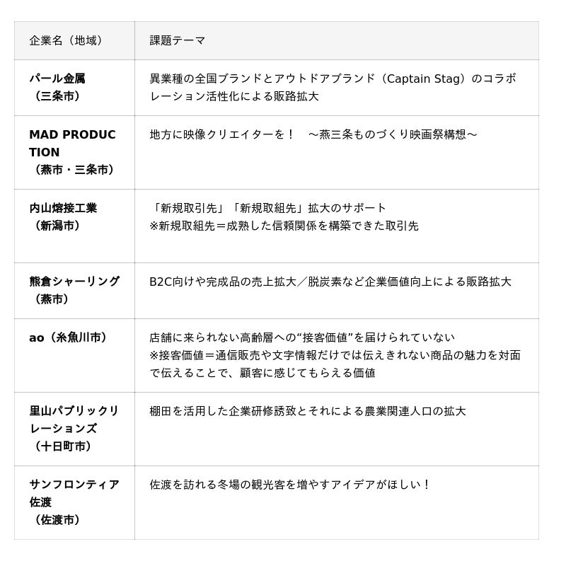チャレンジ新潟は、2023年からスタートし今年で3年目になります。今回から、これまでの県内の市町村だけでなく、県内企業が抱える課題やテーマにも対象を拡大し、直接企業とマッチングができるようになりました。地域に根差す企業の課題に対して、県内外のソリューションを持つ企業との共創をさらに促進します。▶チャレンジ新潟の詳細について: