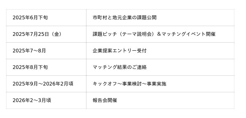 本プログラムでは、「市町村・地元企業の課題の深堀」から「企業とのマッチング」、「マッチング後のプロジェクト組成」、「事業化に向けた伴走支援」までをトータルでサポートし、年度内の小さな事業実施を目指します。