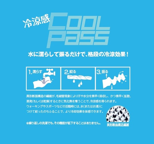 異形断面の繊維が毛細血管現象により、汗や水分に素早く反応、かつ素早く拡散する際に気化熱を奪う事で冷涼感を得られます。