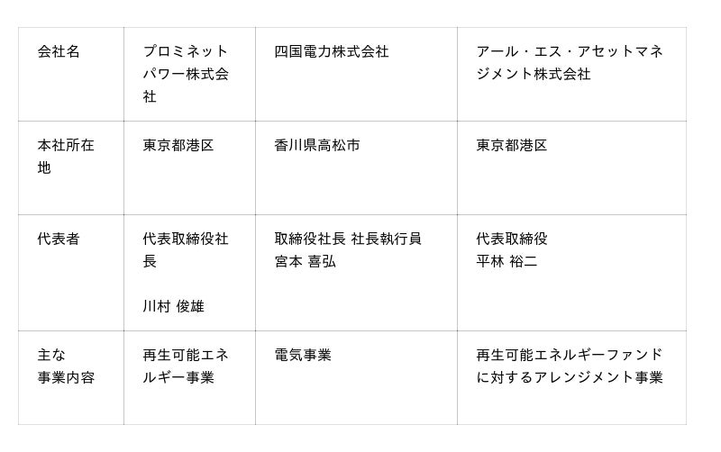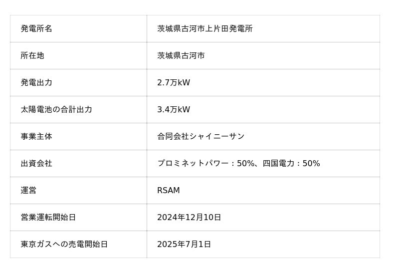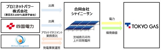 東京ガス株式会社(取締役 代表執行役社長:笹山 晋一、以下「東京ガス」)100%出資子会社のプロミネットパワー株式会社(代表取締役社長:川村 俊雄、以下「プロミネットパワー」)と四国電力株式会社(取締役社長 社長執行役員:宮本 喜弘、以下「四国電力」)は、アール・エス・アセットマネジメント株式会社(代表取締役:平林 裕二、以下「RSAM」)が組成した発電事業を行う合同会社シャイニーサン(以下「シャイニーサン」)に対して2社で共同出資することで太陽光発電事業(以下「本事業」)に参画し、本日、シャイニーサンは東京ガスへの売電を開始しました。