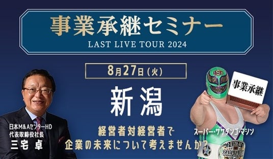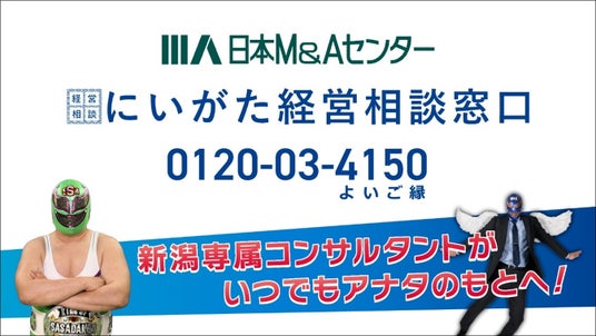 株式会社日本M&Aセンターホールディングス(以下、当社 / 本社:東京都千代田区 / 代表取締役社長:三宅 卓)の連結子会社である株式会社日本M&Aセンター(以下、日本M&Aセンター / 本社:東京都千代田区 / 代表取締役社長:竹内 直樹)は、「にいがた経営相談窓口」に関する新テレビCMの放映を新潟エリアにて開始いたしました。新潟県で覆面プロレスラー兼経営者として活躍するスーパー・ササダンゴ・マシンが登場し、8月27日(火)に新潟市で開催する事業承継セミナーにも登壇いたします。