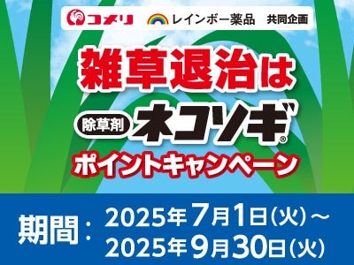 コメリ・レインボー薬品 共同企画「雑草退治はネコソギ(R)ポイントキャンペーン」条件:期間中、対象の除草剤ネコソギシリーズを同日お買い上げ 税込3,000円を1口として、抽選でポイントプレゼント。