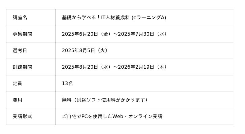 IT人材養成科は、IT業界で必要とされる知識・スキルを体系的に学び、幅広い業種に通用する人材を目指す職業訓練コースです。本コースでは、以下の内容を学ぶことができます。