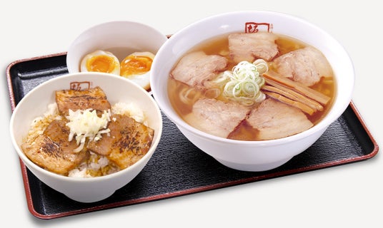 炙り焼豚ご飯セットラーメンに乗ったトロ旨焼豚と、ご飯に盛った香ばしい焼豚をWで味わえるお得なセット。
