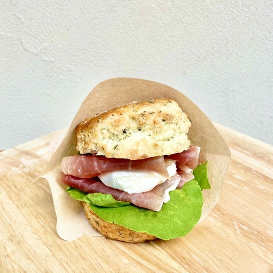 焼き立てのバジルペッパーのスコーンに生ハムとクリームチーズを贅沢に挟みました。
