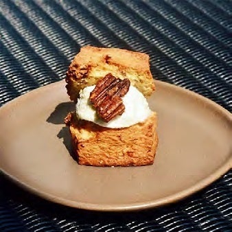 自慢のスコーンにトッピングでバニラアイスをサンド。キャラメルナッツと冷たいアイスナッツの香ばしさや甘さを引き立てるために塩を少し振ることで、絶妙なおいしさのアイスサンドスコーンに仕上げます。
