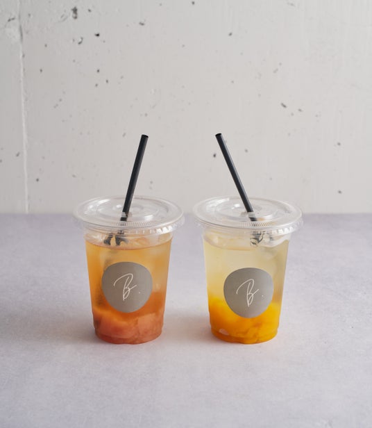 <BEYOND SWEETS(ビヨンド スイーツ)>左:桃とグアバジュレのアイスティー、右:マンゴーとオレンジジュレの翡翠レモンティー 各701円(各1杯/ともに日本製)※出店期間:7月19日(土)~7月22日(火)