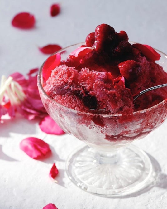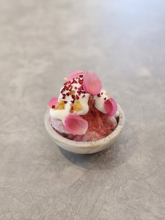 ザクロ×レモンの甘酸っぱい夏にぴったりのかき氷に、美味しい食用バラをトッピングして上品な香りがアクセントに。