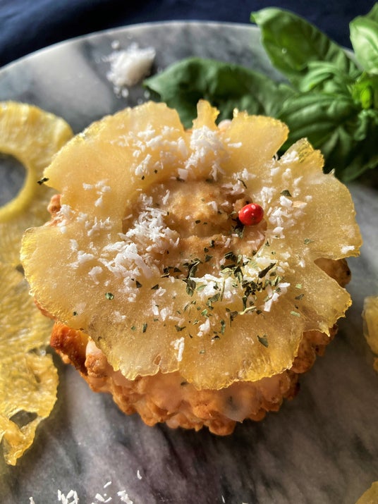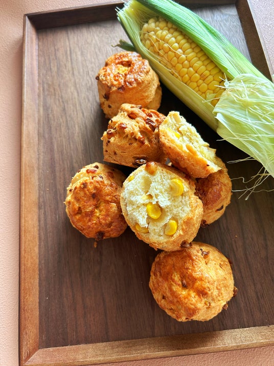 北海道 剣淵町出身のシェフが作りたかった「焼きとうきび」をスコーンに。「とうきび」をバターとアンチョビ醤油で焼き、たっぷりのパルメザンチーズとカマンベールチーズで仕上げ、さらに表面には、卵黄と醤油を塗りました。