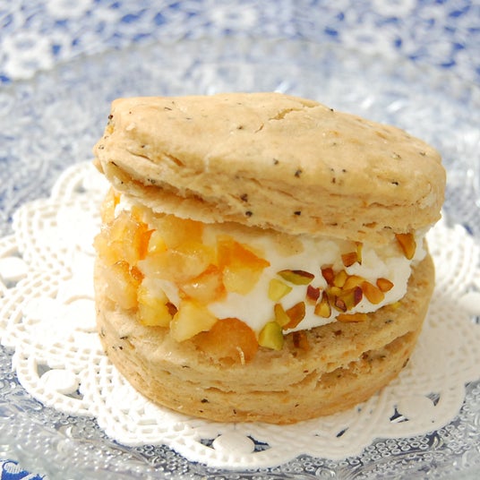 純粋蜂蜜を贅沢に使用したしっとり生地のアールグレイスコーンに、北海道製造のマスカルポーネを使用した自家製クリームをたっぷりサンド。トッピングのオレンジとピスタチオの深みあるハーモニー。※1歳未満の乳児には与えないでください。