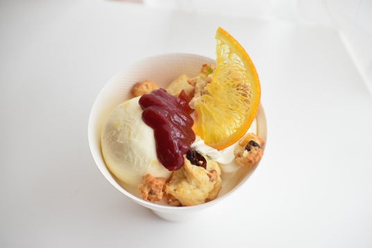 アサイーボウルを思わせるトロピカルな紅茶にヨーグルトシャーベットをフロート。マンゴーやパイナップルの果肉も入ったスイーツドリンク。