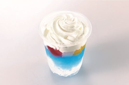 ミニストップの人気スイーツで30周年を迎えた「ハロハロ」をイメージしたパフェです。爽やかなブルーと透明の2種のラムネ風味ゼリーの上に、苺ゼリー、ナタデココ、パイン、マンゴーをトッピング。その上に北海道練乳のホイップクリームをのせた、見た目も食感も楽しめるスイーツです。