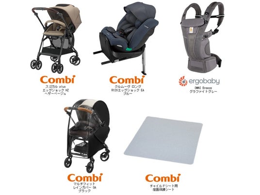 陽射しから赤ちゃんを守る大きな幌を採用したイオン限定モデルのベビーカーと、新生児から135cm(10歳頃)まで長く使えるロングユースタイプのチャイルドシート、柔らかい肌ざわりと優れた通気性を持つSoftFlexメッシュを使用しただっこ紐に、レインカバーとチャイルドシート用保護シートをセットでご用意しています。