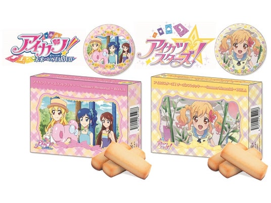 幅広い年代に人気の「アイカツ!」「アイカツスターズ!」のお菓子4品目をイオン限定で展開します。チーズソフトクッキー4本と、缶バッジが6柄のうちランダムで1個封入されています。おまけの缶バッジはアニメの夏エピソードの場面写をプリントしています。(おもちゃ売場で展開しています。一部品揃えの無い店舗があります。)