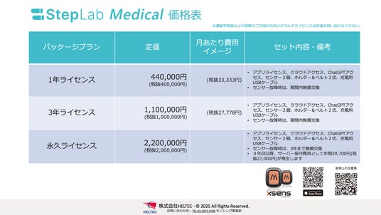株式会社HELTEC(本社:茨城県ひたちなか市笹野町1-1-55、代表取締役社長:小瀬拓人)は、これまで歩行の研究領域で好評価をいただいている歩行評価ソリューション「StepLab+(ステップラボ プラス)」を、臨床領域でより多くの方々にご利用いただけるよう、新たに医療機器の認可を取得し、医療機関向けの専用ラインナップ「歩行分析計 StepLab Medical」を2025年7月1日より販売開始いたしました。