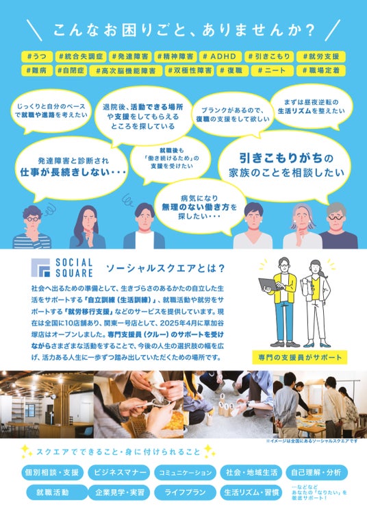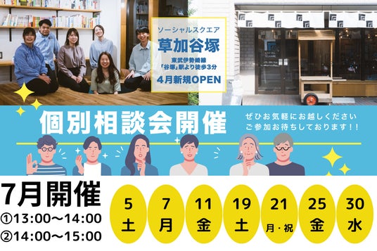 SOCIALSQUARE草加谷塚店(運営:NPO法人ソーシャルデザインワークス 代表理事:北山剛)では、7月5日(土)より、第2期個別相談会を随時開催いたします!