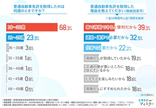 普通自動車免許を取得した年齢は「18~20歳」が約7割!取得した理由とは?