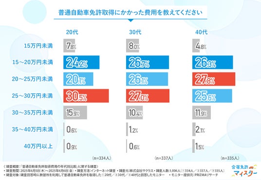 そこで今回、合宿免許比較サイト「合宿免許マイスター」(https://menkyo-meister.com/)を運営する株式会社サクラスは、教習所を利用して普通自動車免許を取得した1.20代/2.30代/3.40代の方を対象に、「普通自動車免許取得費用の年代別比較」に関する調査を実施しました。