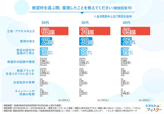 ・教習所選びで重視したことはどの年代も「立地・アクセスのよさ」「費用の安さ」「教官の評判や指導の丁寧さ」が上位に
