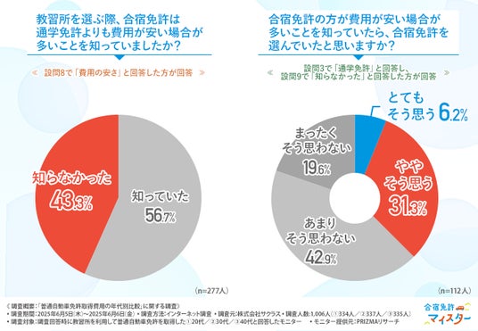 また、『費用の安さ』も全年代において2番目に多い結果になりましたが、教習所を選ぶ際に、合宿免許が通学免許よりも費用が安いことを知っていた方はどの程度いるのでしょうか。