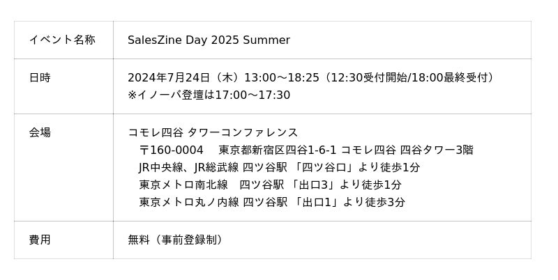 株式会社イノーバは、2025年7月24日、コモレ四谷 タワーコンファレンスにて株式会社翔泳社 SalesZine編集部が主催するイベント「SalesZine Day 2025 Summer」に登壇いたします。