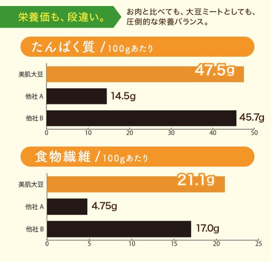 他社B:17.0g一般的な大豆ミートと比較しても、たんぱく質・食物繊維ともにトップクラスの含有量を誇ります。