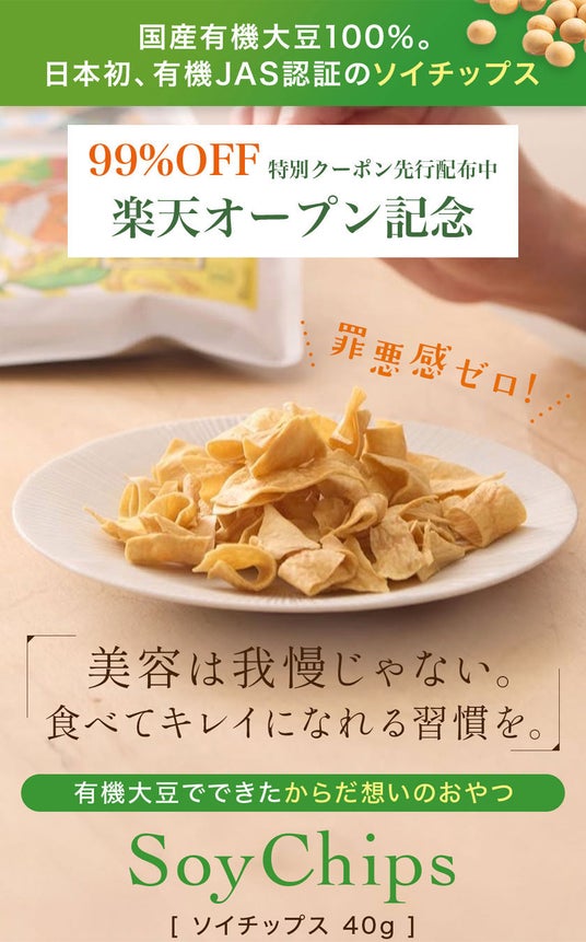 an・anやTarzanなども取り上げられた国産有機大豆を使用したダイエットおやつ『ソイチップス/ソイボー』を99%OFFで購入できる、