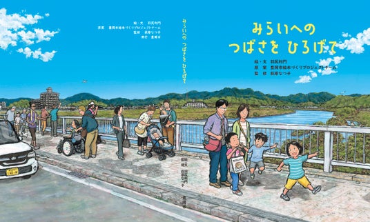 完成した絵本の表紙・裏表紙(豊岡市を流れる円山川と市街地を望む風景)