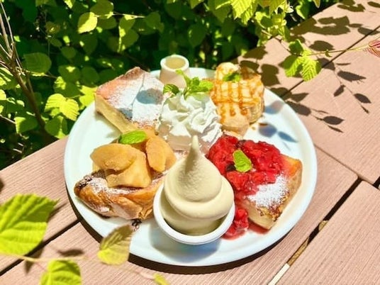 ミックスベリーソース、バナナ、ローストアップル、キャラメルソース、クリームと、我ガママなトッピングのフレンチトースト。