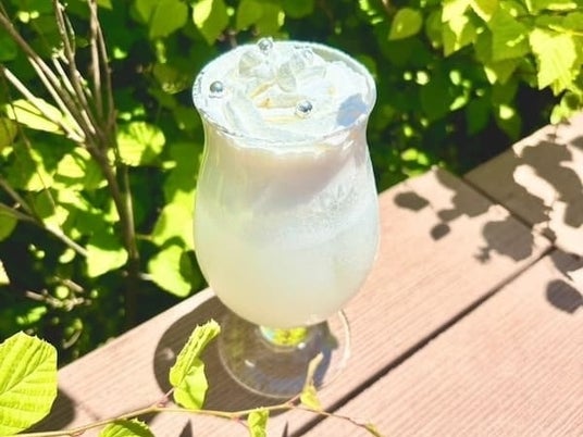 カルピス、炭酸水、ヨーグルトホイップ、アラザン、粉糖 冬の雪で真っ白に染まった景色と、ちらほらと散る銀色に輝く雪結晶が見えるドリンク。ホワイトクリームソーダになっていますが、甘さ控えめのサッパリ感があります