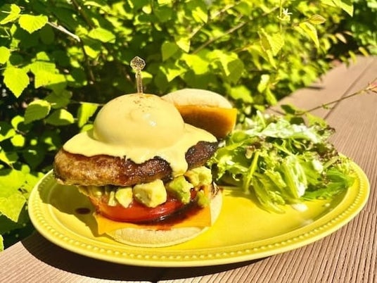 チェダーチーズ、トマト 、アボカド、ハンバーグ 、ポーチドエッグ、テリヤキソース、オランデーズソース、サラダミックスをイングリッシュマフィンにサンドした、思わず好きと言いたくなる黄身に恋をしたベネディクト。