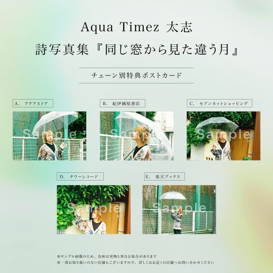 アクアストア、タワーレコード、楽天ブックス、紀伊國屋書店、セブンネットショッピングでの詩写真集の予約・購入者には、チェーン別絵柄のポストカードを特典としてプレゼント。ポストカードには、川島小鳥が撮り下ろした太志のポートレートを使用しています。