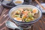 【調理メニュー】すずきのタイピーエン風スープ夏が旬のスズキに、ベビーホタテの海鮮と、キャベツやニンジン、コーンなどの野菜、つるっとした春雨を合わせ、食べやすく仕上げた、中華風のスープ料理。タイピーエンは中国福建省福州市の郷土料理で、アヒルの卵と独特のワンタンが入ったスープ。日本では、ワンタンを春雨に代えてアレンジされ、広がりました。