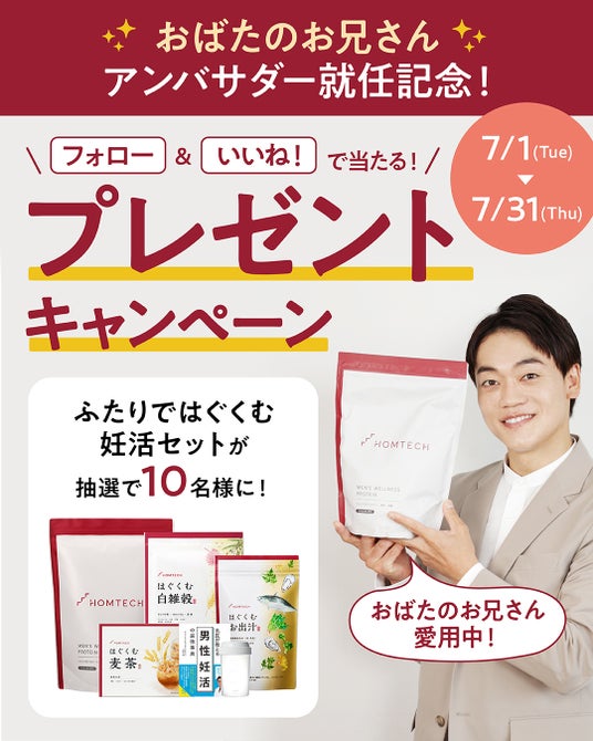 今回のWEBCMでは、実際に妊活を経験されたおばたのお兄さんに、ご自身の妊活体験を振り返っていただきながら、当時感じていた不安や戸惑い、そして得られた学びについてお話しいただき、男性側の健康管理や、意識改革の必要性について語っていただきました。また、実際に「HOMTECH[オムテック]」のプロテインやはぐくむシリーズをお試しいただいた感想もいただいております。