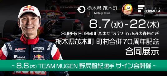 国内最高峰で最速のフォーミュラカーレースシリーズである全日本スーパーフォーミュラ選手権(以下「SUPER FORMULA」)を運営する株式会社日本レースプロモーション(代表取締役社長:上野禎久、本社:東京都千代田区、以下「JRP」)は、8月24日(土)・25日(日)の2日間にわたり、栃木県茂木町にあるモビリティリゾートもてぎにて開催される2024 SUPER FORMULA第5戦もてぎ大会に向けて、町村合併70周年を迎えた地元茂木町と合同で、8月7日(水)~8月22日(木)の16日間にわたり、茂木町まちなか文化交流館「ふみの森もてぎ」にて、SUPER FORMULAの車両や写真、映像の特別展示を開催します。また、期間中8月8日(木)には昨年のもてぎ大会にて予選1位からの完全優勝を果たしたTEAM MUGEN野尻智紀選手が来場し、サイン会を開催いたします。是非、夏休み期間中のこの機会にお子様やお友達とお越しください。