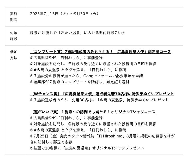 キャンペーン参加者は、広島県内の「源泉かけ流しで入れる低温泉・冷鉱泉」7カ所を巡り、広島県営SNS「日刊わしら」に該当7カ所に関する内容を投稿するだけ。利用施設数に応じて称号が授与され、コンプリートすると「広島夏温泉大使」に認定されます。さらに達成者には認定証が授与されます。