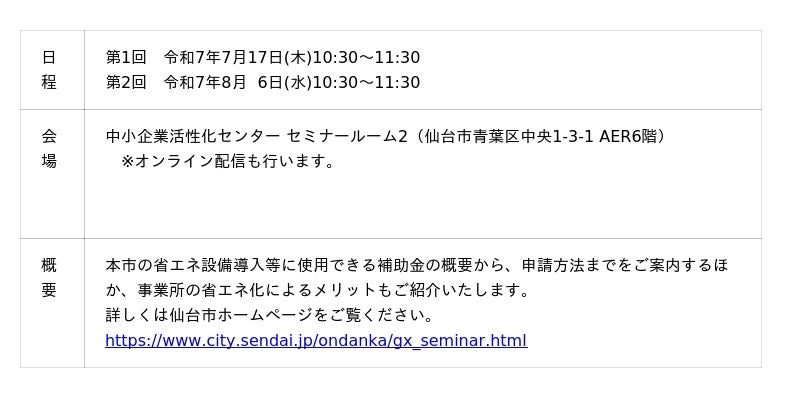 また仙台市では、上記補助金の概要から申請方法までを分かりやすくご案内する説明会を開催します。ぜひご参加ください!
